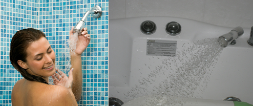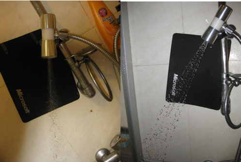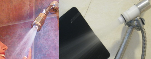 下圖為美國EDL(左)花灑的噴射水形與本發(fā)明水龍頭(右)的花灑水形出水形態(tài)